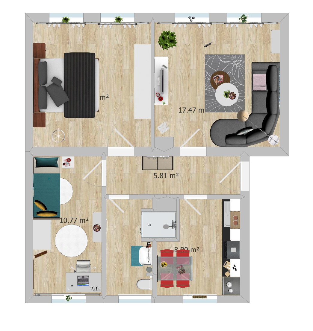 Möblierter Mustergrundriss dient nur als Einrichtungsbeispiel, die Wohnung wird unmöbliert vermietet.