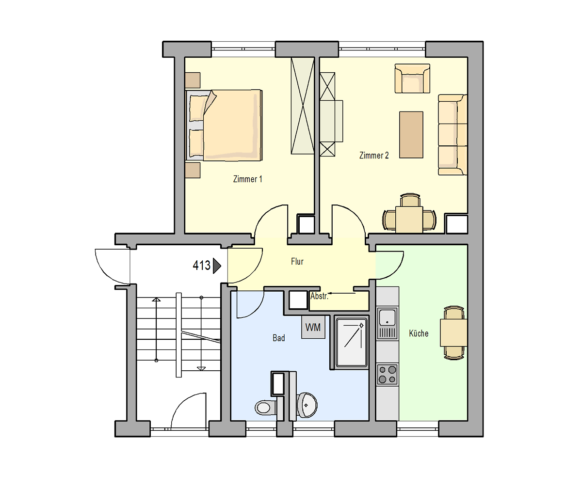 2-Raum-Wohnung im 1.OG, separater Abstellraum mit Schiebetür im Flur, großzügiges Tageslichtbad mit Feinsteinzeugfliesen und ebenerdiger Wohlfühldusche sowie Anschluss für Waschmaschine, Vinylbodenbelag Holzoptik in Wohnzimmer/Schlafzimmer/Küche und Flur, weiße Zimmertüren, Kellerabteil,
